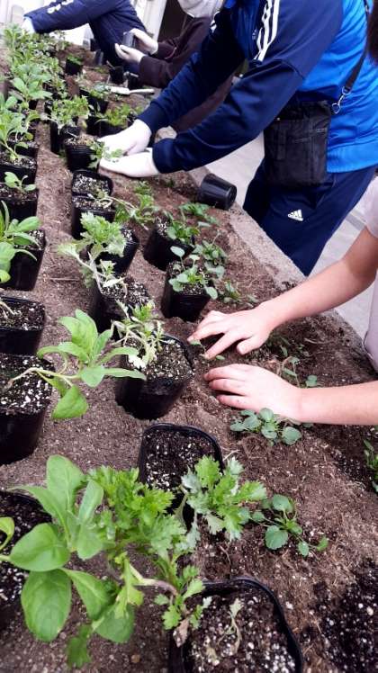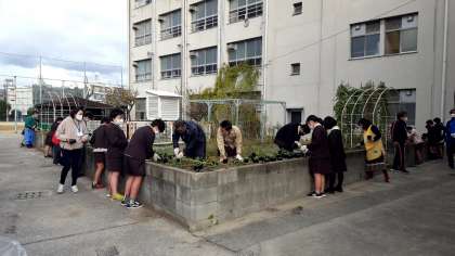 栽培美化委員会の様子です。今年度初めて「花咲かせ隊」の方々との合同作業が実現しました。この日が来るまで、お花の種から育て、水やりを続けてこられたポット苗をていねいに植え付けていきました。きれいなお花が咲くことを楽しみにしています。