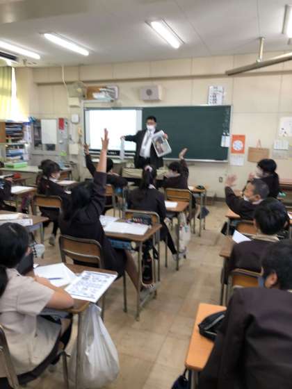 社会見学に行けなくなった新聞社から記者の方に来ていただき、講師として出前授業をして頂きました。