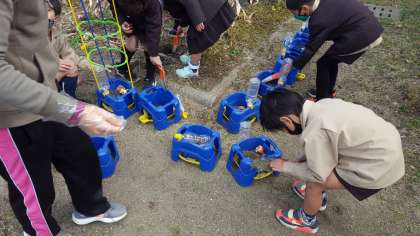学習園でにぎやかな声が聞こえてきたので見に行ってみますと1年生が自分の植木鉢にチューリップの球根を植え付けているところでした。「やわらかいおふとんをかけてあげてね。」と担任の先生の言葉を受け、子どもたちは土を柔らかくほぐしてから球根にかけてあげていました。早く春が来ないかな〜?今から楽しみです。