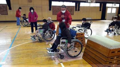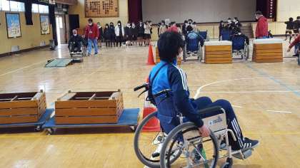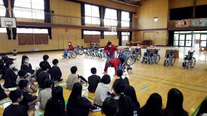 大阪市立心身障がい者リハビリテーションセンターの方々にお越しいただき、今日は4年生が車いすの体験授業を受けました。はじめに車いすの操作方法や止まるときや降りるときにどうするか、曲がり方、などの説明を一通り聞いた後、実際に体育館内で作られたコースを車いすにのって一人ずつ回りました。一人ずつ実際に座って自分で操作することができました。