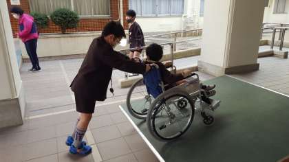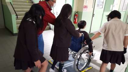 体育館で練習した後は、次は3〜4人の班になって1階の廊下のコースをぐるりと1周しました。ピロティにはスロープもあるのですが、下りでは反対向きに降りたり、上りでは後ろの人におしてもらったり、大小さまざまな段差もチームで協力して乗り越えていました。実際に体験した感想をぜひお家でも聞いてみてください。