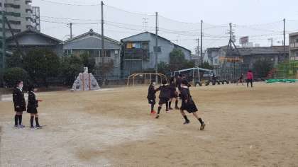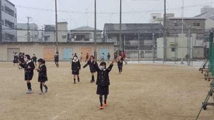 4年生がちょうど学年全体で「ふえおに」をしようとしていたとき、冬将軍が空から粉雪のプレゼントをくれました。粉雪の舞う中での「ふえおに」の様子です。ちょうど下校時刻となった低学年の児童も「明日(土曜授業で)学校に来たら、いっぱい積もってたらいいなあ。」と言っていました。