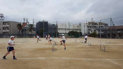 6時間目、5年2組は運動場でハードル走をしていました。ハードル間の距離の異なるコースを走って比べ、一番気持ちよく走れる歩数を考えながら走っていました。