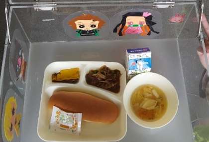 今日の給食は「牛肉のデミグラスソース煮、コーンとはくさいのスープ、かぼちゃのプリン、コッペパン、アプリコットジャム、牛乳」でした。デミグラスお肉がとっても柔らくておいしかったです。