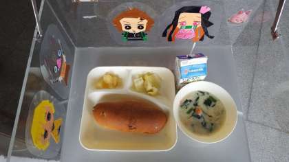【写真は本日の給食:ほうれんそうのクリームシチュー、キャベツのサラダ、洋なし(カット缶)、レーズンパン、牛乳。昼休みの様子です。】