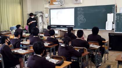 1時間目6年2組ではC-NETの先生からアメリカの中学校の話を聞いていました。