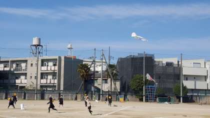 6時間目1年2組はまたもや凧揚げの再挑戦!今日の風はどうだったでしょうか?
