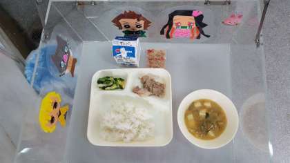 本日の給食は「豚肉のしょうが焼き、とうふのみそ汁、菜の花のおひたし、かつおぶし、ごはん、牛乳」でした。「菜の花のおひたし」は噛むと口の中で春の香りが広がるようで、柔らかくておいしかったです。