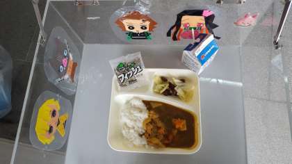 今日の給食はチキンカレーライス、ビーンズサラダ、ミニフィッシュ、牛乳でした。ラッキーにんじん入っていたかな?