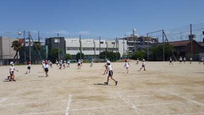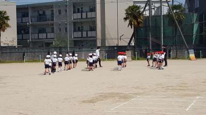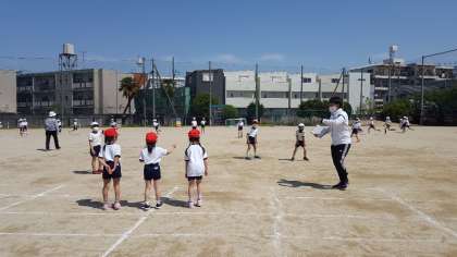 1年生の体育の様子です。素晴らしいお天気の中、運動場を元気いっぱい動いていました。並ぶ練習も間隔をあけてとっても上手でしたよ。