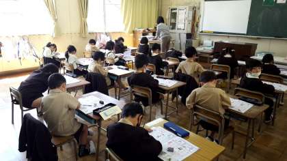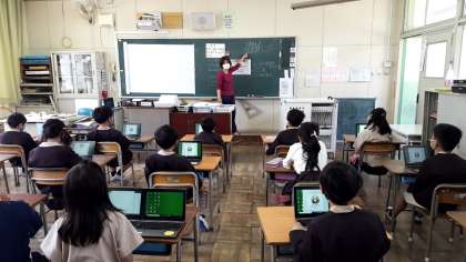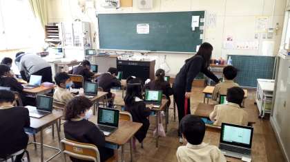 今日は午前中は2時間の授業でしたが、各学年パソコンを使ってオンライン学習の練習をしたり、午後からや明日1,2時間目の自習課題の説明を聞いたりしました。