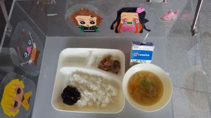 今日の給食は、豚肉のごまみそ焼き・すまし汁・海苔の佃煮でした。