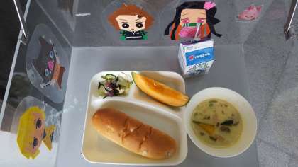 本日の給食は、おさつパン・牛乳・かぼちゃのクリームシチュー・ミックス海藻サラダ・クインシーメロンでした。