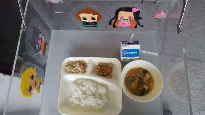 本日の給食は・・・豚肉の香味あげ・味噌汁・もやしのおひたし・ごはん・牛乳でした。