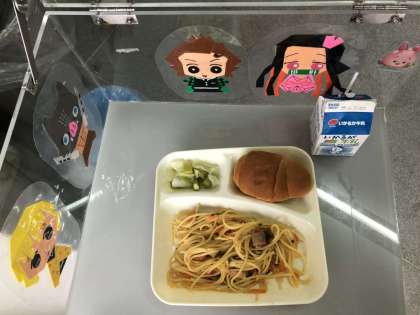 本日の給食は・・・チキントマトスパゲティ・グリーンアスパラとキャベツのサラダ・発酵乳・パン・牛乳