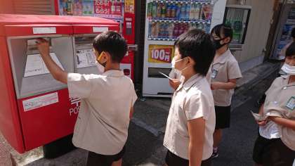 2年1組では、心を込めて書いた暑中お見舞いを皆で投函しに行きました。
