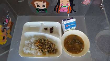 今日の給食は「他人丼、とうがんのみそ汁、金時豆の煮もの、牛乳」でした。