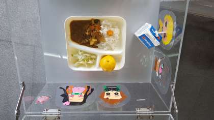 本日の給食は、「ポークカレーライス(米粉)、キャベツのピクルス、おみかん、牛乳」でした。