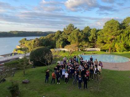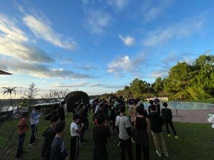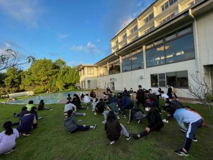 体操係による朝の体操をして、景色の良い場所で記念撮影をしました。