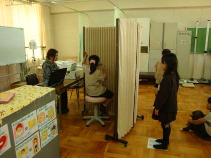 オージオメーターを使用し、30デシベル、25デシベルの音域を調べ、音が聞こえたら手をあげます。