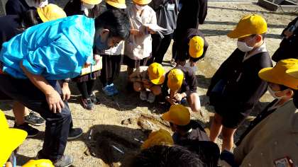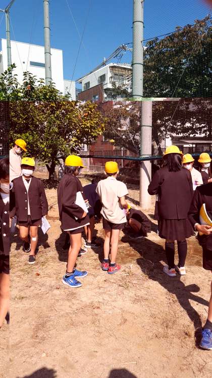 運動場の奥の方から声がするので行ってみますと、5年生たちが土山に水路を作って水を流していました。聞くと「流れる水のはたらき」の学習で自然な形を実際に作って川のように水を流し、裾野へ広がっていく水流の様子を観察しているとのことでした。みんなとても興味深く観察していました。