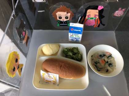 今日の給食は、きのこのクリームシチュー、きゅうりのバジル風味サラダ、りんご、コッペパン、マーマレード、牛乳でした。秋のきのこの味をおいしくいただきました。