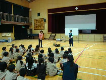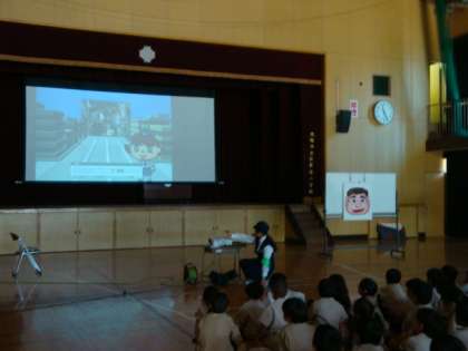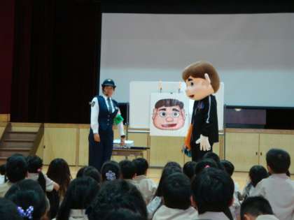 着ぐるみやDVDなどを使い、1年生にもわかりやすく防犯について教えていただきました。
