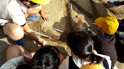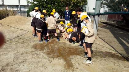 昨日の5−1と同様、5−2も「流れる水のはたらき」を学習のため、土山に川を作り、観察しました。川の内と外とでは、水の流れがどうなるのか、土はどうなるのか、水量によってどう違うのかなど・・・沢山の事がわかりました。