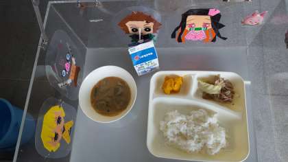 今日の給食は、豚肉とまいたけの炒め物・いわしのつみれ汁・かぼちゃういろう・ごはん・牛乳