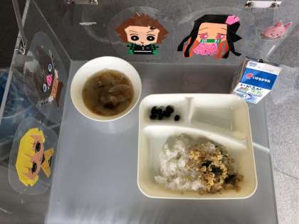 今日の給食は・・・親子丼、すまし汁、黒豆の煮物、ごはん、牛乳でした。