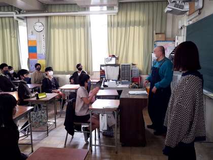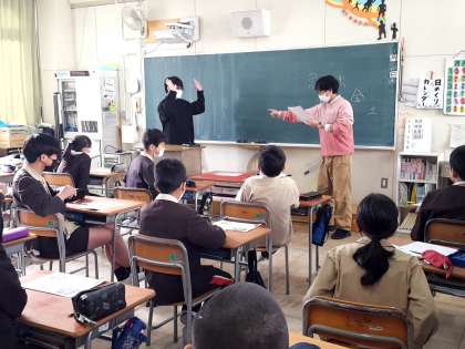 先週に引き続き今日は劇団員さんによる出前授業がありました。「ジェスチャーゲーム」では、「二人で声を出すことなくいかにリズムや拍子を合わせるか」をテーマにみんな楽しそうに取り組んでいました。「笑顔」と「アイコンタクト」が大事なんですね。