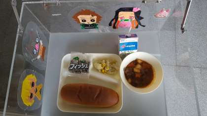 3枚目は今日の給食(ビーフシチュー、カリフラワーのピクルス、ミニフィッシュ、黒糖パン、牛乳)です。ビーフシチューは子どもたちに大人気でした。
