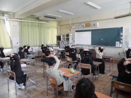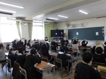 写真は、6年生クイズで、放送を聞きながら、〇×頭の上でつくりました。