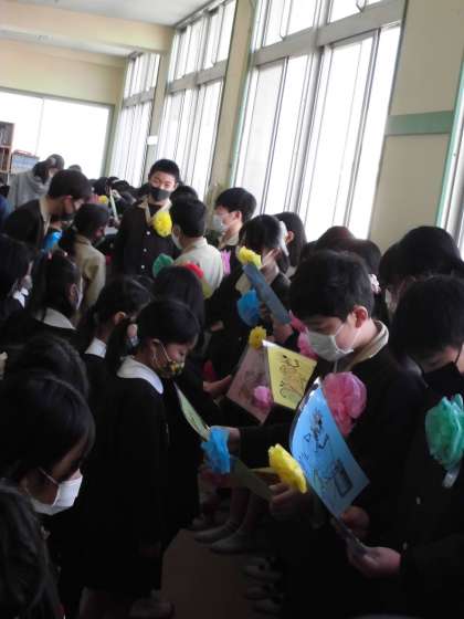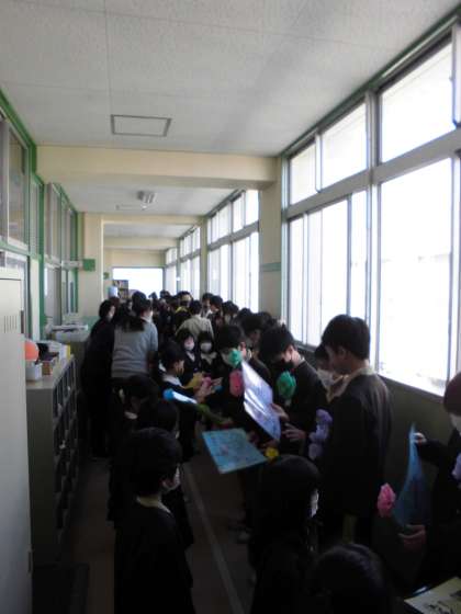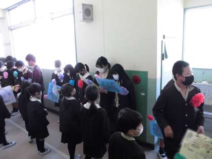 写真は、1年生から6年生へお祝いのメッセージを渡しているところです。