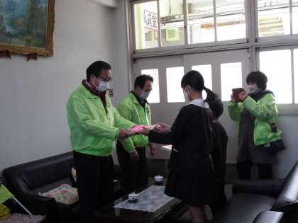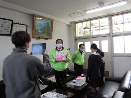 5年生の代表の児童2名が校長室でお礼の良い、全校児童で作成した色紙を渡しました。