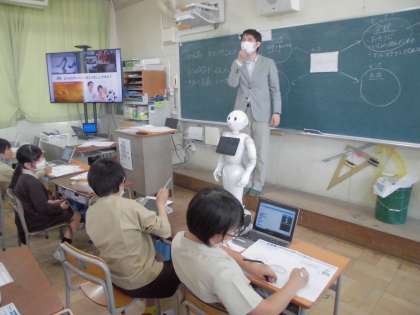 4年生に、ペッパー君がきてくれました。一緒にプログラミングについて学習しました。自分で考えた未来のロボットについて意見を出し合ったり、自分のパソコンを使ってペッパー君と話ができるようにプログラミングをしたりしました。