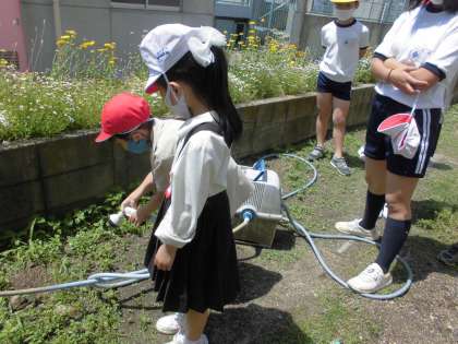 学年ごとにいろんな植物を植えています。サツマイモ、トマト、ナス、ヒョウタン、ヘチマなどなど・・・学級の当番が水やりをしています。