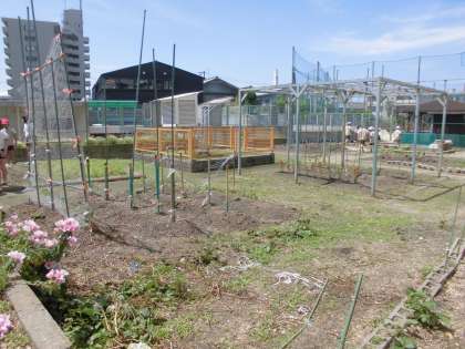 学習園の周りには、アサガオやミニトマトの植木鉢が置かれています。夏に向けて植物の成長が楽しみです。