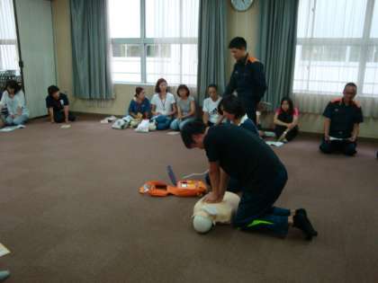 住之江消防署の方々にお越しいただき、胸骨圧迫やAEDの使い方を教わりました。