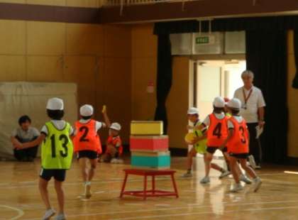 真ん中に段ボールを3つ積み、攻めの4人が守備2人をかわしてボールを当てます。
