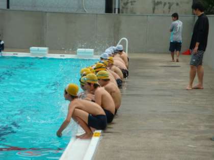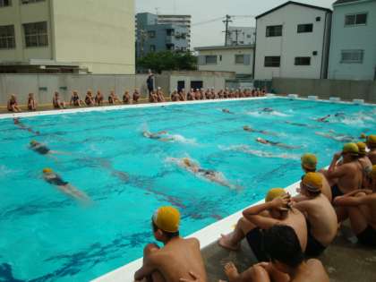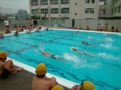 加賀屋東小学校の6年生が来校し、プールで交流会を開きました。
