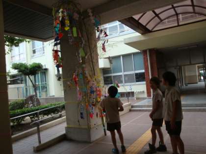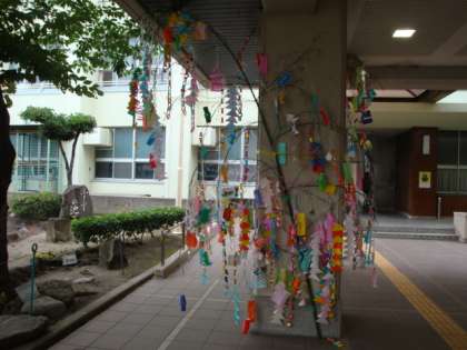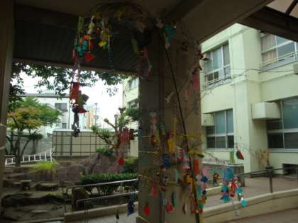 大きな笹の木に七夕の飾りつけをして、ピロティに飾っています。