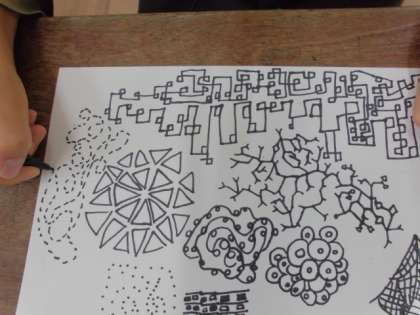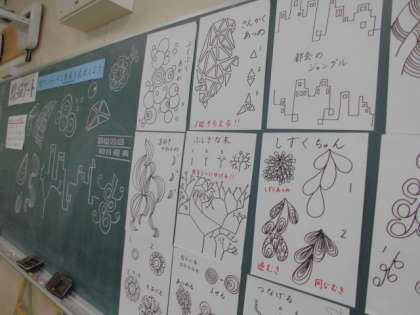 「模様のパターン」は、「ぶくぶくあわわ」「都会のジャングル」「しずくちゃん」など、いろんな種類を知りました。子どもたちはパターンを組み合わせて真剣に集中して線描しました。友達の作品鑑賞タイムでは「うわ、すごい!」「これ、おもしろいな!」などの声が聞かれました。