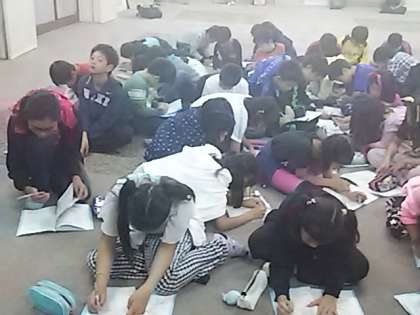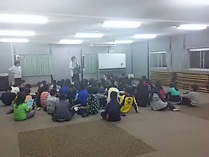 キャンプファイヤーで盛り上がった後、宿舎の多目的室で反省会をしました。盛り上がり過ぎて、現在予定より1時間遅れの10時です。