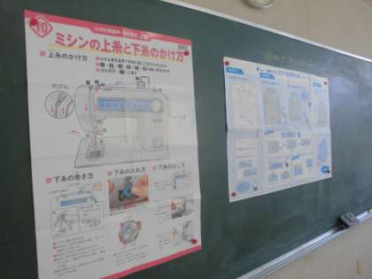 ミシンの上糸と下糸のかけ方をグループの友達と確認し合いました。けがをしないように間違えないように、真剣に取り組みました。