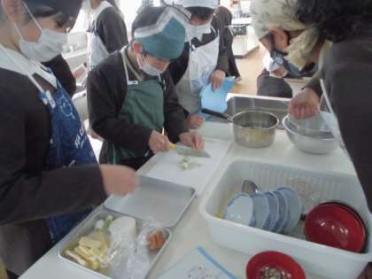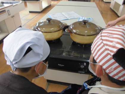 ご飯とみそ汁の調理実習をしました。計画表を見て、火力の調節や時間を注意深く確認し、食材を切りました。家でお手伝いする子も多く、包丁さばきが上手でした。