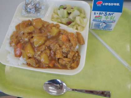 今日の給食は、「チキンカレーライス、ビーンズサラダ、ミニフィッシュ、牛乳」でした。