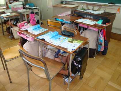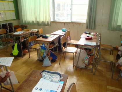 訓練の放送で、机の下に身をかくし頭を守りました。