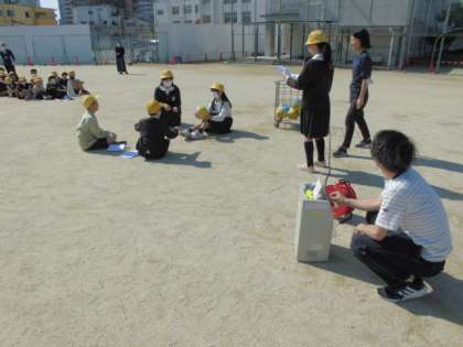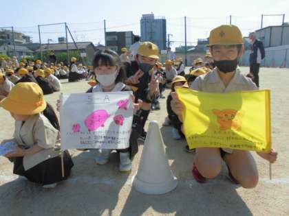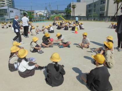 加賀屋小学校では、児童集会を毎週木曜日に行っています。児童集会では基本的にたてわり班(異年齢で構成された班で約10名チーム×2)で活動します。今日は「ばくだんゲーム」をしました。集会委員会の係が、ルールやゲームの仕方を説明しました。音楽に合わせてボールをばくだんに見立ててまわし、音楽が止まった時にボールを持っていた人がアウトとなります。その人は自分の名前と好きなものを班のみんなに発表しました。