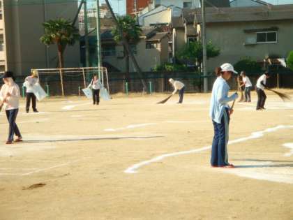 にがりをまくことによって、砂埃が舞い上がるのを防ぎ、土が定着しやすくなるそうです。